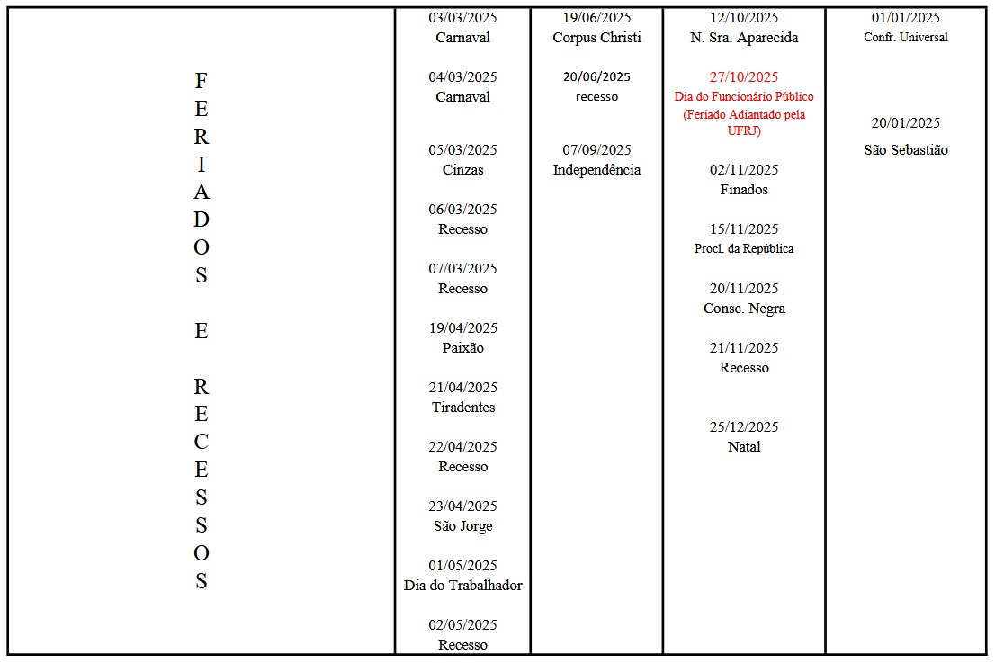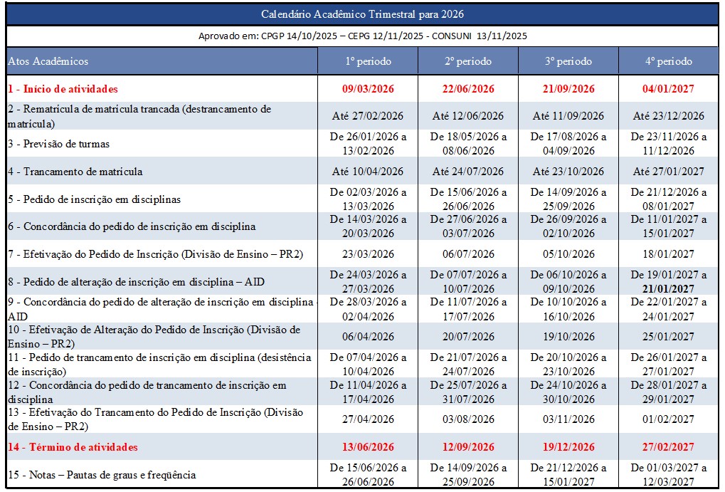 Calendário Acadêmico – Ano: 2026 Calendário Acadêmico – Ano: 2025 Calendário Acadêmico – Ano: 2024 Calendário Acadêmico – Ano: 2023 Calendário Acadêmico – Ano: 2022 Calendário Acadêmico anterior – Ano: 2021 Calendários Acadêmicos de 2011 até 2020